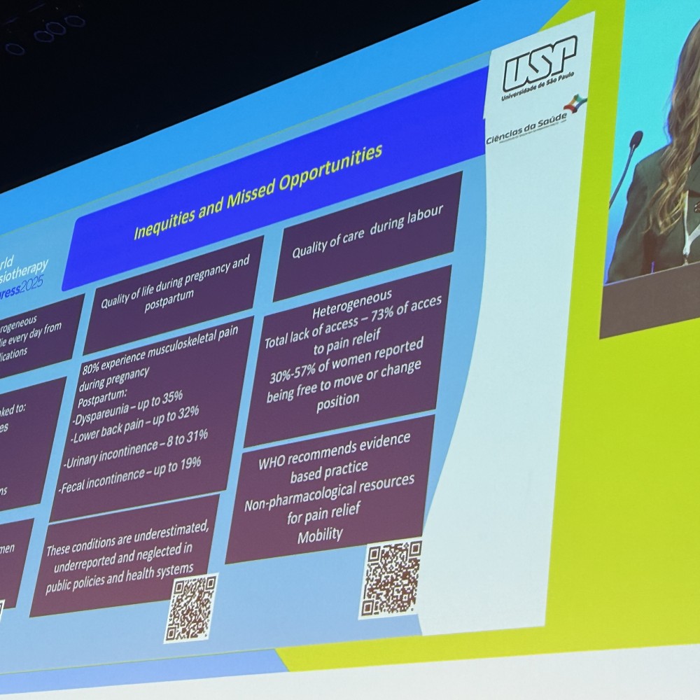 Christine Homsi Jorge (Brazil) explored the discipline’s evolution, tracing its origins in obstetrics through to its broader application in gynaecology and chronic conditions. She detailed recent advocacy wins in Brazil that have expanded women’s access to physiotherapy during pregnancy, birth and postpartum. Despite these advances, she stressed that 800 women still die every day from preventable causes related to pregnancy and childbirth—most in settings without adequate care. Christine urged all attendees to consider how they advocate for women. Physiotherapy has high level of evidence to impact obstetric care. Evidence is not enough – we must identify the gaps and make organisations stronger to fight for women’s care.